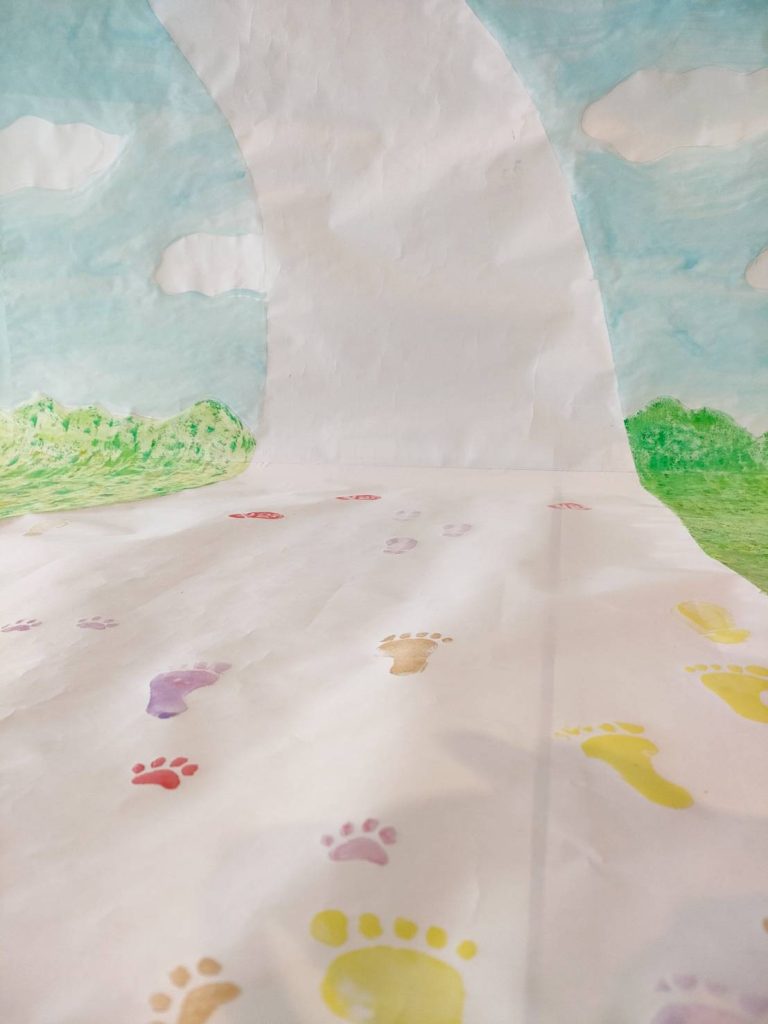 用意した足跡のスタンプを来場者の皆さんに自由に押していただき、少しずつ“みんなでつくる道”が広がっていく作品です。会期中、会場に置かれた作品が、来場者一人ひとりの参加によって変化し、育っていきます。