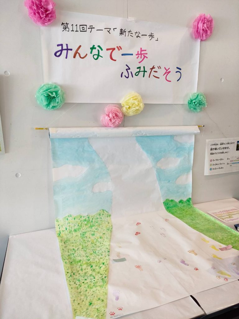 第11回やくも美術くらぶぱれっと展では、会場内に来場者参加型アート作品「みんなで一歩ふみだそう」を設置しています。